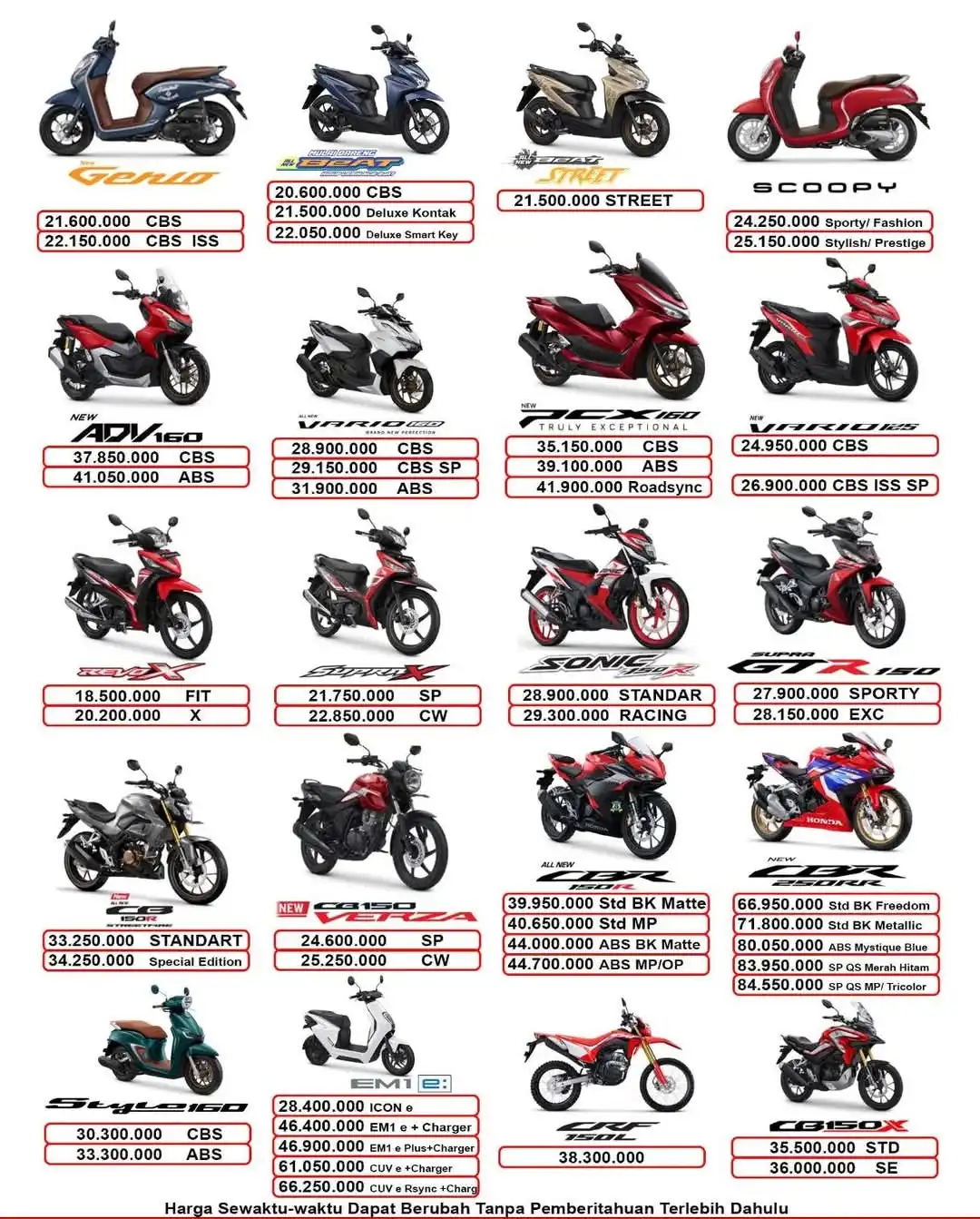 CRF150L (PH/HH) | 38.300.000 | Rp11.100.000 |